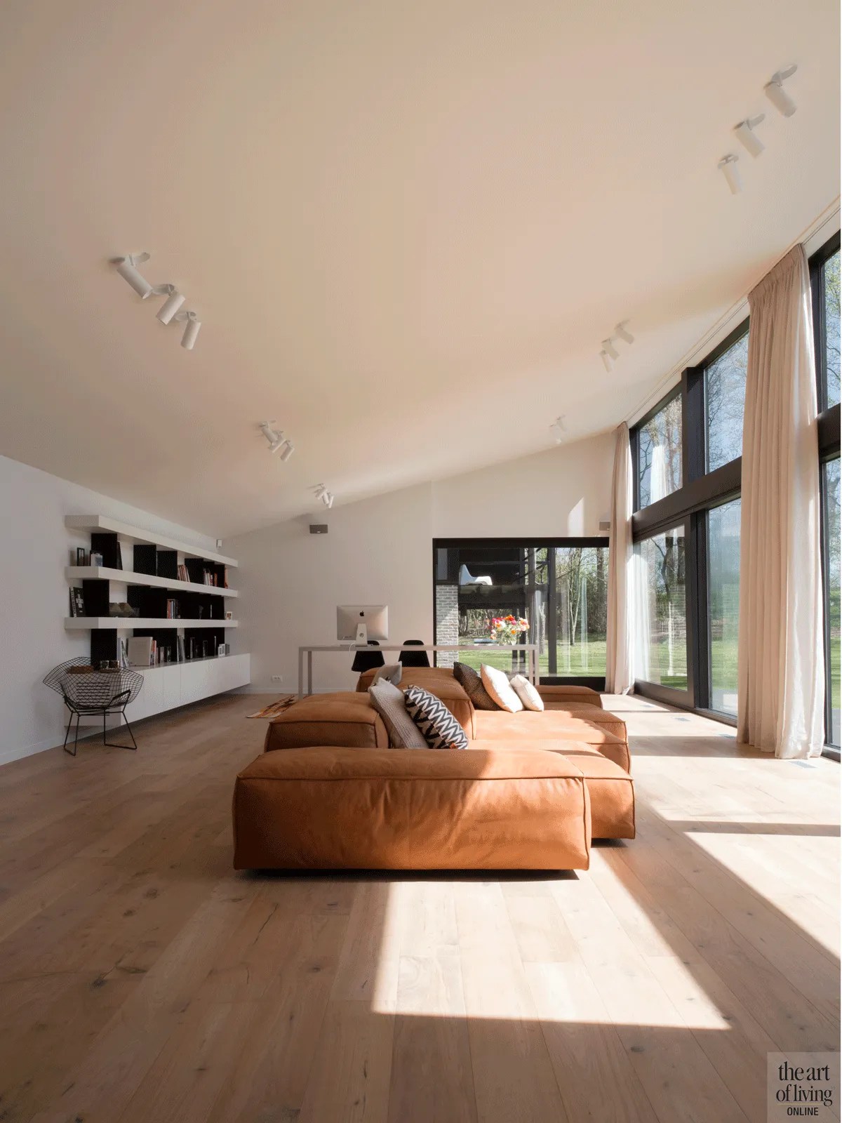 De projecten worden tot en met het interieur in detail uitgewerk. Reden te meer voor architect andy ramus van ar design studio om de herkenbare structuren te behouden.. Deze strak vormgegeven ruime woonst, die vorm krijgt door een combinatie van leien en een open latwerk in hout, sluit prachtig aan bij het glooiende natuurlandschap.